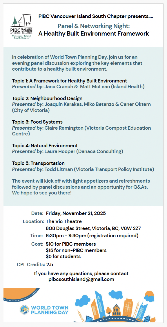 Register Here Now! In celebration of World Town Planning Day, join the PIBC Vancouver Island South Chapter for an evening at The Vic Theatre for a panel discussion exploring the key elements that contribute to a healthy built environment.